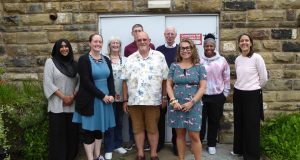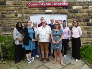 The full Community Rail Lancashire Team outside the Bunker, L-R, Shahiesta Raja, Catherine Kingdom, Caroline Holden, Dave Savage (back), Simon Clarke, Richard Watts (back), Karen Bennett, Sophia Sanderson & Katie Douglas
