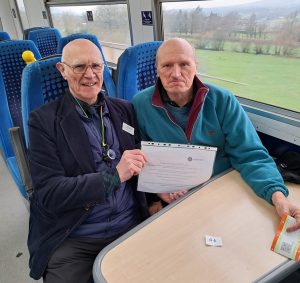 Bill Briggs (left) from Ribble Valley Rail presents Mr. P Metcalfe with his voucher from Northern – photo © Pete Eastham